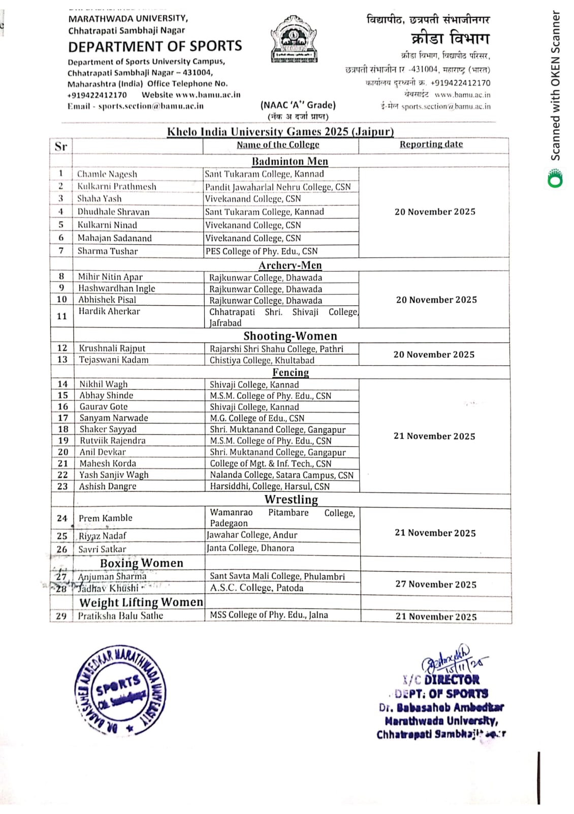 | 2 | खेलो इंडिया युनिव्हर्सिटी गेम् | 2025-11-24 | Extra-curricular | Dr. B.A.M.University | 01 | 2 | 0 |